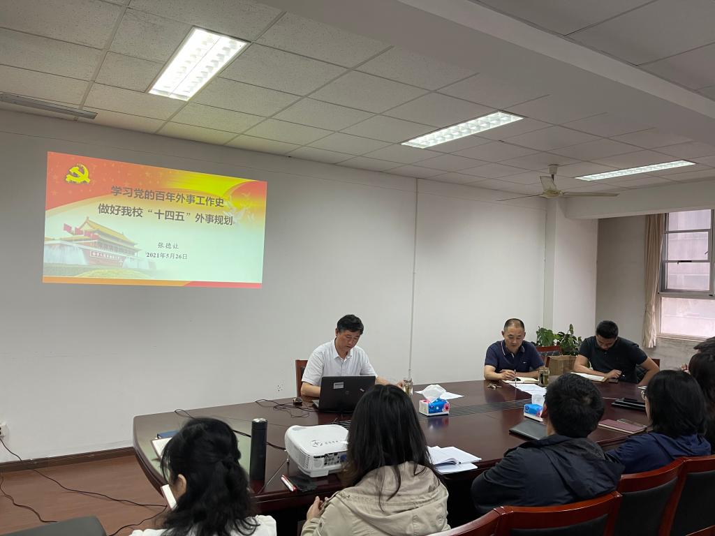张德让首先介绍了党的百年外事工作史四个时期,梳理了改革开放以来中国高等教育国际化发展的三个重要阶段,重点分析了在习近平新时代中国特色社会主义思想指导下,党和国家外事工作取得的重大历史性成就,剖析了改革开放以来中国高等教育国际化从初步探索、规模扩张到当前提质增效的发展历程和现实意义。再次,在认真学习贯彻相关文件基础上,剖析了高等教育国际化面临的新形势,特别是把英国365集团与其他高校进行综合对比,分析我们在国家进一步扩大教育对外开放、推进“一带一路”倡议、建设美好安徽大背景下所面临的诸多机遇和挑战。最后,张德让从完善国际化办学机制、深化国际交流合作和强化职工教育三个方面明确国际交流合作处“十四五”外事工作思路和目标,同时从人才培养国际化、队伍建设国际化、科研合作国际化、职工教育内涵建设和孔院内涵建设几个方面提出落实举措。
