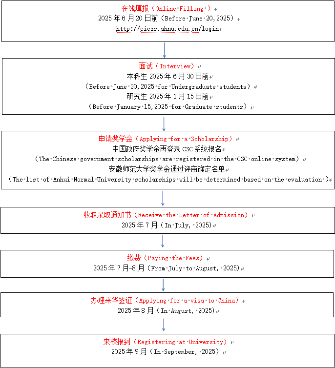 Hello, thank you for your interest in Anhui Normal University! Please log in Anhui Normal University's online application system at: http://ciezs.ahnu.edu.cn/login, and fill in your application information online.