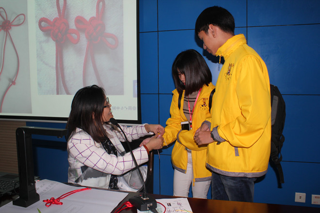 张老师首先介绍了中国结的基本类型,从来源、用途、象征寓意等三个方面讲解中国结的基本常识,以“服饰之结”“神灵之结”“时尚之结”等指出中国结是中国特有的民间工艺,常用于表示美好的祝愿。张老师结合PPT图文并茂的展示了同心结、纽扣结、手链、吉祥结等中国结制作技法,为帮助营员解决制作中国结过程中遇到的困难,将营员分成12个小组,每组配备一名志愿者。营员们在了解中国结编制线头的握法和走位后,纷纷投入其中。在张老师及志愿者的鼓励与指导下,营员们亲手编出了精致的中国结,兴奋的拿在手中展示,并与周围的朋友互相交流编织中国结的感受与经验,欢声笑语不断。