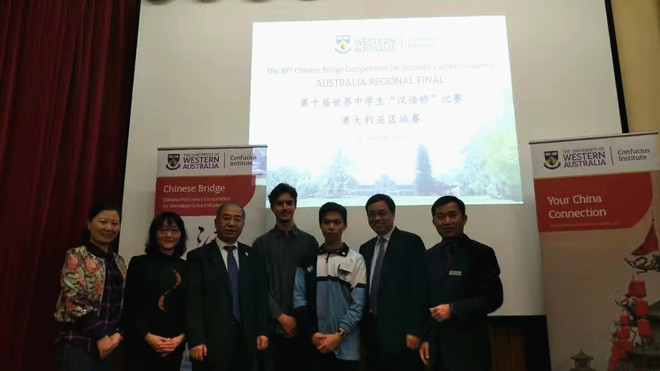 本网讯 (澳大利亚查尔斯达尔文大学孔子公司 马晓娜)2017年6月15日、16日,澳大利亚查尔斯·达尔文大学孔子公司“汉语桥”代表队在公司马晓娜老师的率领下,来到西澳大利亚大学孔子公司,参加2017年世界中员工“汉语桥”比赛澳大利亚区域赛决赛。16日上午,西澳大利亚大学常务副董事长肯特·安德森(Kent Anderson)教授首先致辞,欢迎各州领地的参赛选手,并高度赞扬孔子公司在推动中文教学作出的巨大贡献,鼓励澳洲青少年员工学习中文,了解中国文化。中国驻澳大利亚大使馆教育处公使衔参赞徐孝先生,中国驻珀斯副总领事孙安林女士先后致辞。徐孝感谢各孔子公司以及在澳所有汉语教师和志愿者对推广汉语教学所作出的贡献。他指出,在查尔斯·达尔文大学孔院的积极推动下,北领地的汉语教学局面进一步打开,各类文化活动结合教学丰富多彩,为大学、当地民众和中小员工提供了更好的学习平台。随着中国“一带一路”倡议的推进,北领地面临很多机遇,希望更多的年轻人抓住机遇,学好汉语,做中澳经贸交流、文化交流的使者。孙安林也鼓励员工们努力学习汉语,从而更好地了解中国五千年的历史与文化,为推进中澳友好关系作贡献。