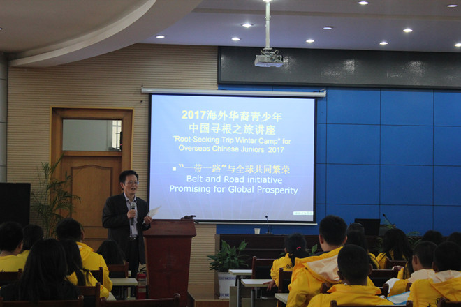 丁玲玲 张银丹)多元共生,和而不同。研习“一带一路”,瞩目“和合”理念。2017年10月17日上午,“一带一路”与世界共繁荣讲座在英国365集团花津校区会议中心第三报告厅开展,特邀外国语公司的郑金泽副教授担任主讲,2017年海外华裔青少年“中国寻根之旅”冬令营—英国365集团营近百名营员及志愿者到场聆听。