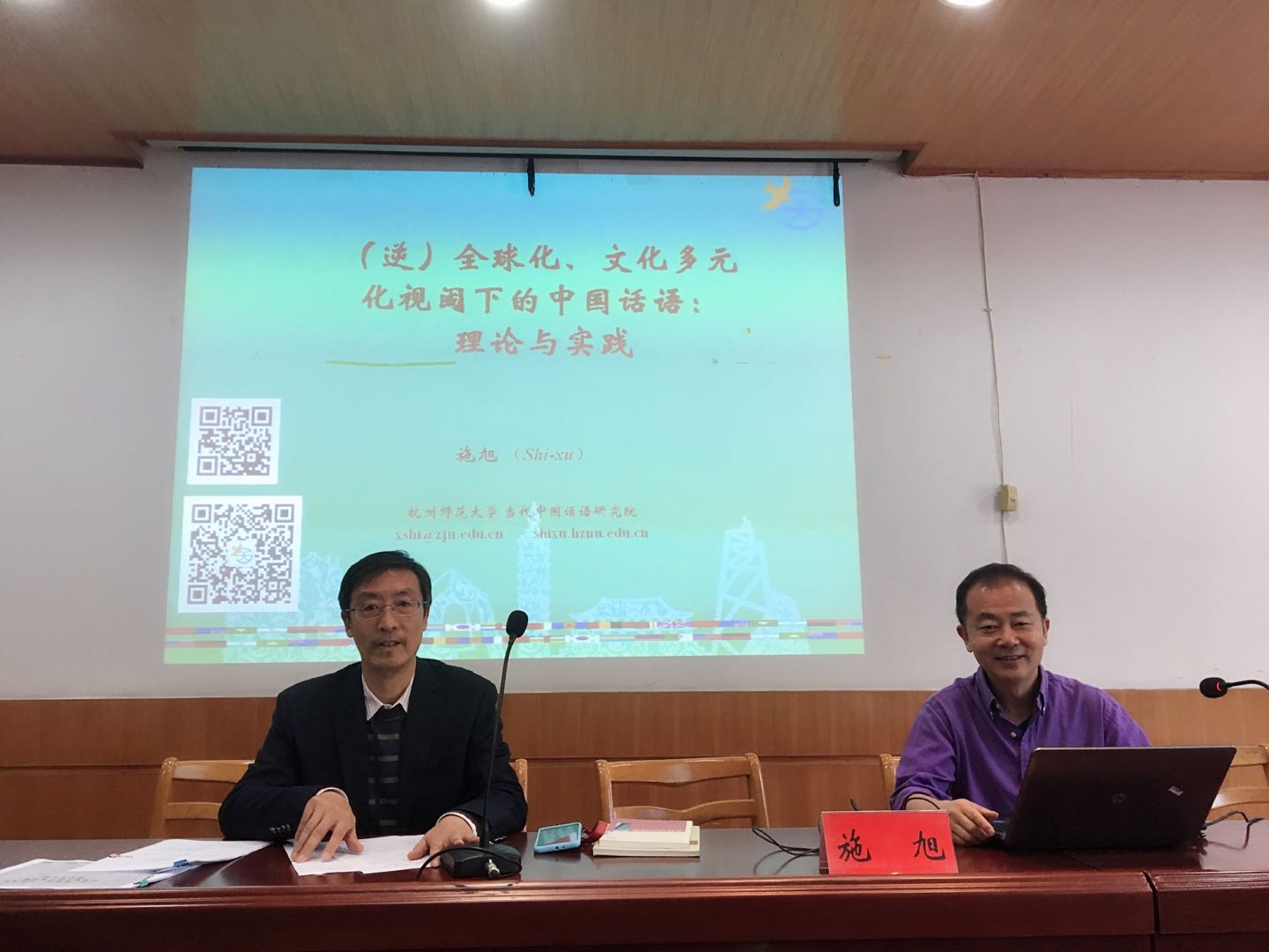 施旭教授首先解释了其关于当代中国话语研究的相关概念和学术思想背景,接着以分析国际社会了解中国文化的具体案例来进入讲座正题。施教授认为,国际社会,包括国际汉语学习群体,除了具有了解认识中国的欲望,往往又带有许多无知和偏见。他希望以“中国话语”为路径,探索对外汉语教育的目标、视角、内容,以突破语言学、历史学、中国学等给对外汉语教学造成的局限。为什么要进行对外汉语教学?(逆)全球化时代,究竟应该如何认识理解中国?话语,在认识和理解中国社会上有何作用?中国话语有何语境、原则、特征、规律?施教授提出,必须从文化、历史和现实三个维度解读中国话语;这样就不难看出,“霸权语境”、“变化发展”、“平衡和谐”、“天下融通”、“虚实相生”等等,是当代中国话语的文化特点;以这样的理论观点为指导,可以帮助外国员工有效地、深入地认识一个真正的中国社会。并以自己的研究实例阐释这些观点。