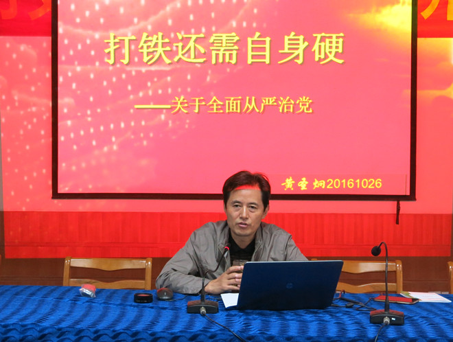 10月21日,支部书记黄圣炯为全体党员讲了一堂题为《打铁还需自身硬——全面从严治党》的党课。他细致地分析了党与国家、民族兴衰的关系,;深入剖析了当前形势下党面临的问题,全面总结了解决问题的方法;不时引用习近平总书记的讲话,强调管党治党一刻不能松懈。