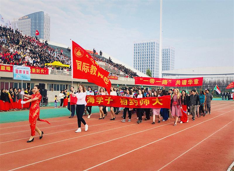 运动会第一天,公司来自五湖四海的职工们身着国家传统服饰,手举“一带一路,共谱华章”的横幅,高呼“共一个师大,同一个梦想”“师大,我爱你”,充分展现了“开放师大”的活力、和谐与包容。