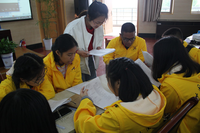 在汉语语音应用环节中,俞老师结合悠扬的音乐做示范,一首《乡愁》,进一步呈现出汉语语音的魅力,引得营员们随声轻呵,意犹未尽。接下来,为达到让营员们充分操练,把营员分成12个小组,12名辅导老师一人负责一组,营员们尽情投入其中,纷纷朗读汉语绕口令、古诗、现代诗。随后,12位营员作为代表上前展示汉语语音应用水平,特别是来自缅甸的3位营员共同朗诵的《再别康桥》令全场噤声聆听,课堂在一片掌声中落下帷幕。