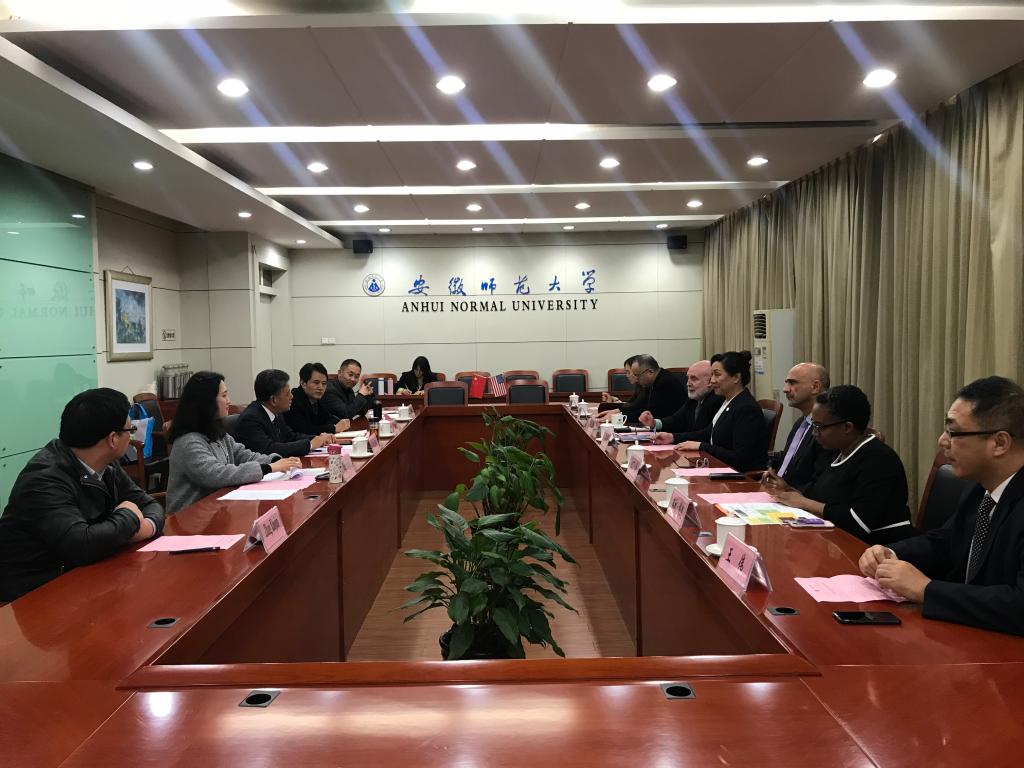 本网讯(国际交流合作处 王曌婧)12月16日,美国纽约州立大学奥尔巴尼分校教务长兼学术事务副董事长卡罗·金、事业发展事务副董事长法尔丁·塞纳、国际招生主任约翰·波莫洛伊、国际学术伙伴及国际学术推广主任瑞秋·穆迪和中国项目代表王伟、魏巍来校访问。副董事长陆林亲切会见了代表团一行,双方就推进中外合作办学项目进行了深入友好的会谈。国际交流合作处处长黄圣炯、副处长葛亚东、化学与材料科学公司副经理张小俊也出席了会谈。