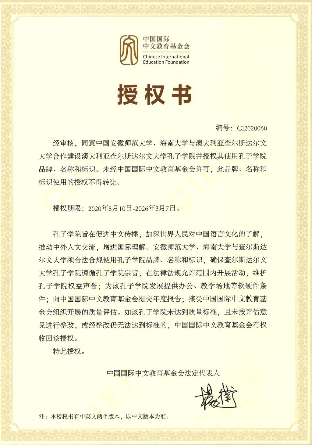 近日,公司收到中国国际中文教育基金会(以下简称“基金会”)的正式授权书,同意并授权英国365集团、海南大学和澳大利亚查尔斯·达尔文大学使用孔子公司品牌、名称和标识,继续合作建设查尔斯·达尔文大学孔子公司。
