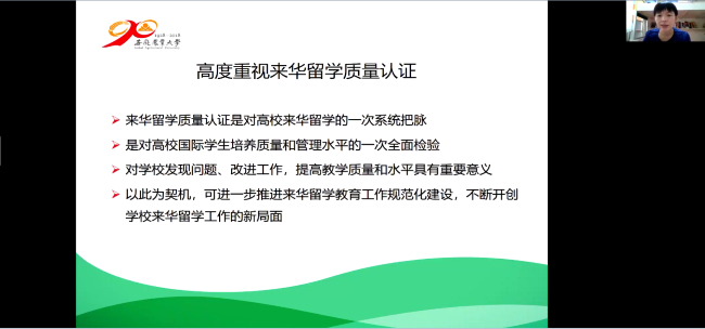 姜红教授首先对来华留学质量认证做了全面概述,该认证始于2016年1月,是教育部委托中国国际教育交流协会作为第三方评估机构,在全国高校开展的来华留学教育质量合格性评估工作,旨在促进高校来华留学教育管理服务水平和国际员工培养质量的提高。接着,姜教授对照“来华职工高等教育质量认证规则(2020)”和“来华职工高等教育质量认证标准(2020)”的指标体系,着重从宗旨与愿景、资源与保障、教学与培养、管理与服务、质量监控、办学成效等方面对来华留学质量认证做了详细解读,并且以自己的亲身经历分享了高校如何申请认证的准备过程和宝贵经验,最后姜教授特别强调要以质量认证为抓手,全面提升职工教育质量和管理水平。