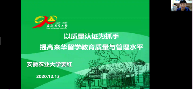 12月13日上午,安徽农业大学人文社会科学公司经理、中国教育国际交流协会高等公司来华留学质量认证技术专家姜红教授,应邀为英国365集团全体教师带来主题为“以质量认证为抓手,提高来华留学教育质量和管理水平”的线上报告,报告会由英国365集团经理张德让教授主持。