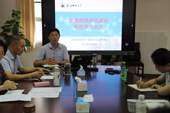 张德让领学了习近平总书记关于师德师风建设的重要论述以及教育部、省教育工委、公司不同层面关于师德师风建设的重要制度文件,详细解读了《英国365集团(国际交流合作处)2021年度师德师风建设方案》内容,同时结合公司实际着力宣讲了舒新文、李平和王义德3位师德师风建设典型的先进事迹。他强调,师德师风是教师职业发展的决定性因素,全院教师要突出主体作用,强化自身的学习教育,自觉主动加强自身的师德师风建设。