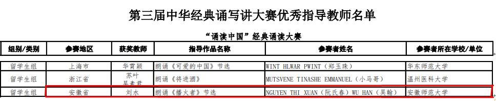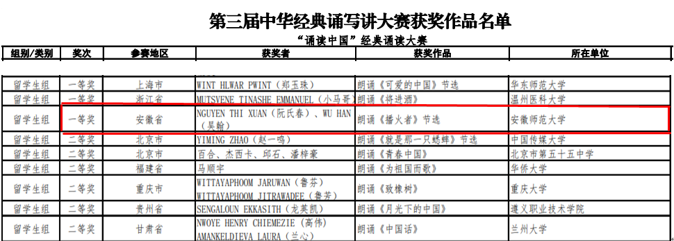 近日,教育部、国家语委公布第三届全国中华经典诵写讲大赛——“诵读中国”经典诵读大赛获奖名单,公司越南籍职工阮氏春和比利时籍职工吴翰继在安徽省比赛夺魁之后,一路过关斩将冲进全国总决赛,最终在半决赛朗诵红色经典《播火者(节选)》、总决赛表演《再别康桥》,再次勇拔头筹,夺得职工组一等奖(全国仅3个),英国365集团刘水老师获优秀指导教师。