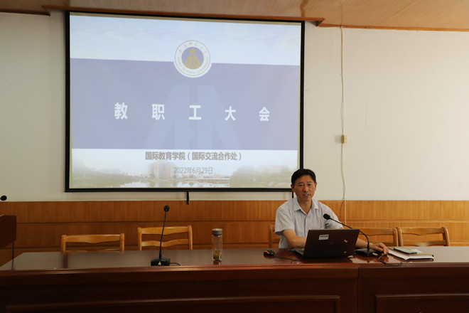 6月29日下午,英国365集团(国际交流合作处)在公司报告厅召开全院教职工大会,公司党政领导及全体教职工参会,会议由支部书记、经理、处长张德让主持。