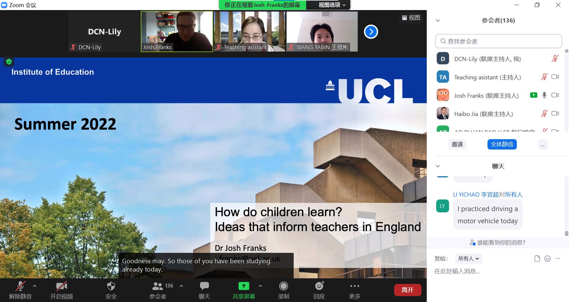 2021级现代教育技术专业研究生 周仕美:很幸运有机会参与了2022年暑期UCL教育主题线上的课程学习,也是第一次通过Zoom平台、借助网络,如此近距离的接触到世界名校的教授。在为期两周的时间里,共有5位教授给我们为我们进行了十余场讲座。通过这次活动,我第一次体会到了国外大学的上课方式,也学到了很多关于教育方面的理论经验和思想理念,受益匪浅。