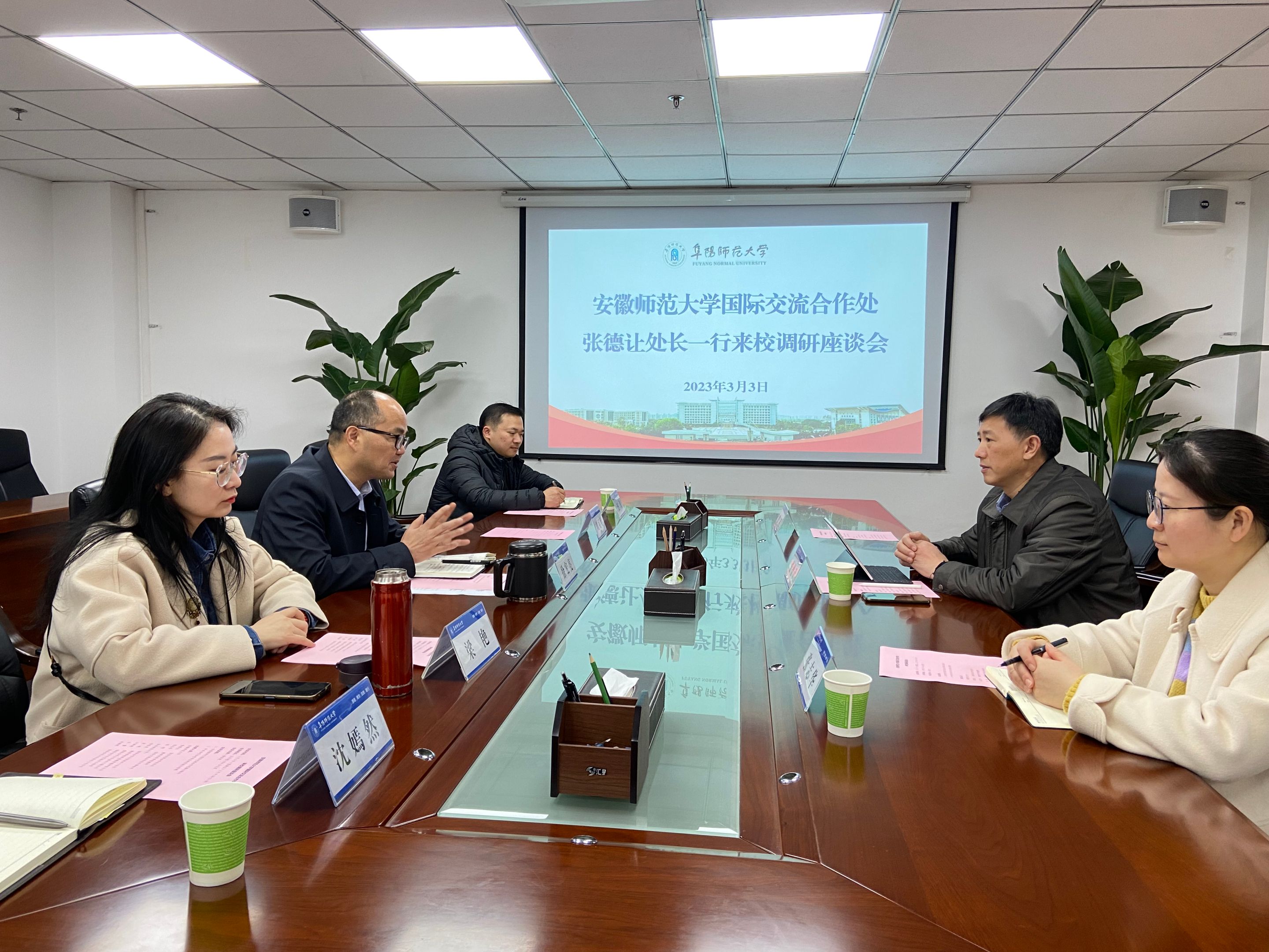 3月3日上午,国际交流合作处处长张德让、外事秘书张超、教育科学公司教师张志华一行3人来赴阜阳师范大学国际合作与交流中心调研交流高校国际化建设、中外合作办学项目管理等工作。阜阳师范大学国际合作与交流中心主任徐宏亮、秘书汪量、外事专办员沈嫣然、教育公司学前教育教研室主任梁艳参加座谈。