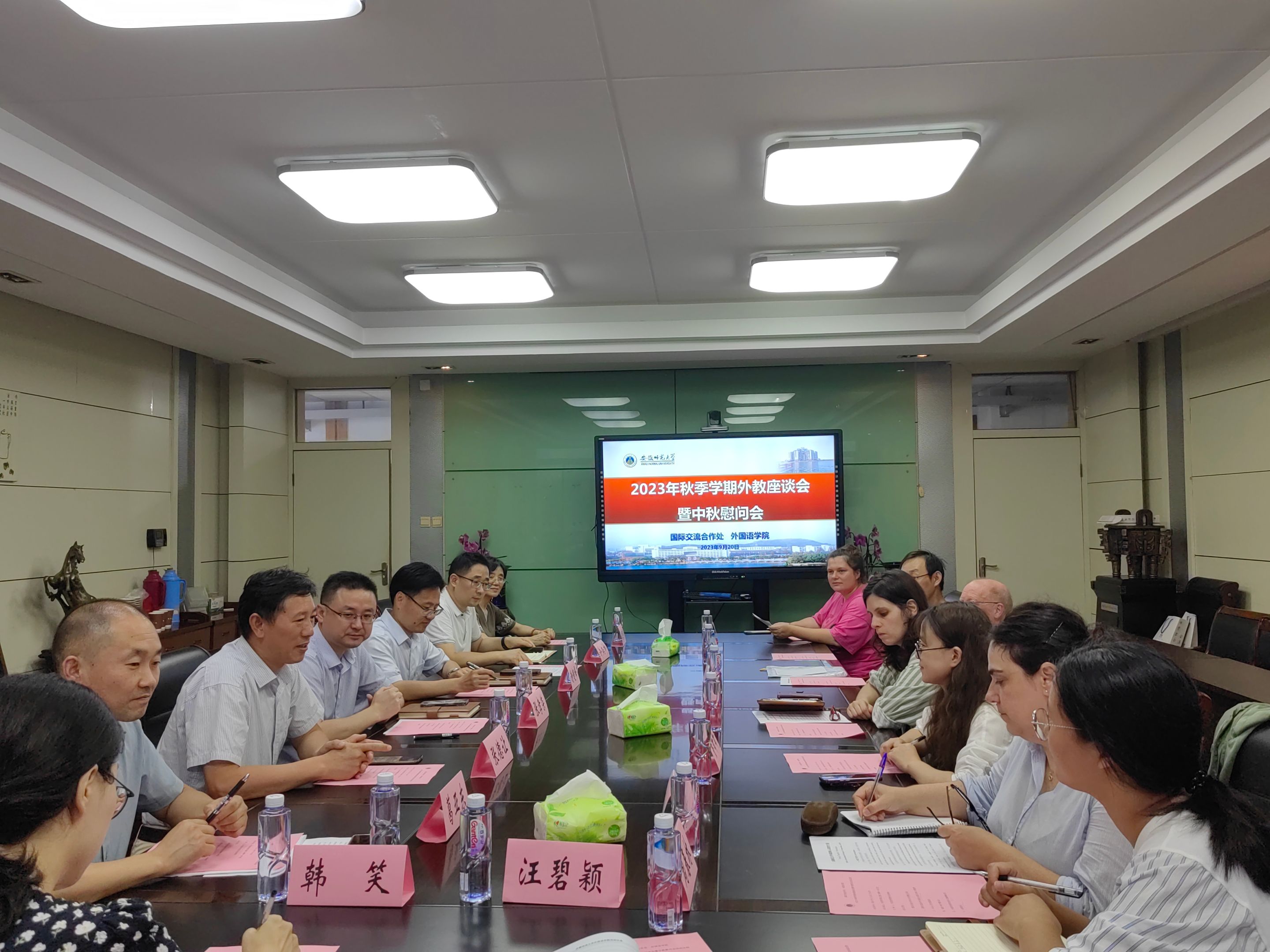 共迎新学期,浓情中秋节。9月20日,国际交流合作处联合外国语公司为公司语言外教举行了一场新学期座谈会暨中秋慰问会。国际交流合作处处长张德让、外国语公司党委书记谢超峰、经理张孝荣、副经理许炳坤、李碧鹰、国际交流合作处副处长葛亚东、外籍教师以及外教联系人等参加了会议,会议由张孝荣主持。