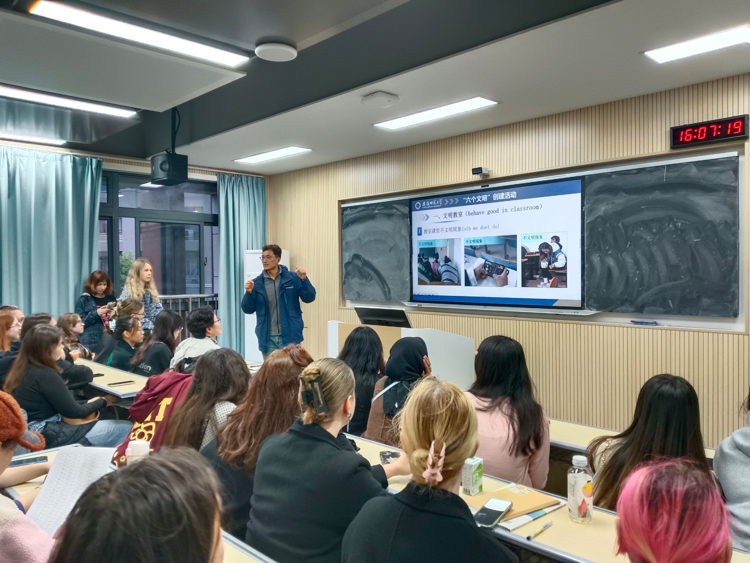 11月1日下午,公司在望道楼A座201教室召开国际员工“六个文明”主题班会。班会由职工辅导员郑甲申主持,全体国际员工参加。