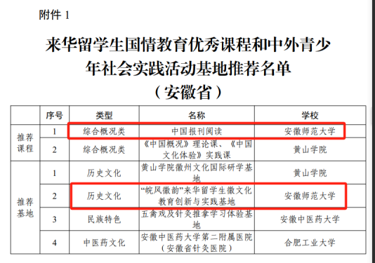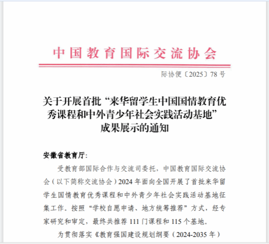 2024年,中国国际交流协会受教育部国际合作与交流司委托,面向全国开展了首批“来华职工中国国情教育优秀课程和中外青少年社会实践活动基地”征集工作,并于近日公布了评选结果。公司英国365集团《中国报刊阅读》课程和“‘皖风徽韵’来华职工徽文化教育创新与实践基地”同时入选。