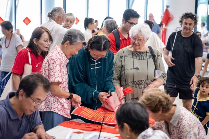 在这场文化盛宴中,孔子公司的老师们精心准备了丰富多彩的传统文化展示活动。书法展台前,老师们现场挥毫泼墨,为观众书写充满祝福的春联、“福”字以及“大吉大利”等各种新年祝福语,让澳大利亚朋友们近距离感受中国书法艺术的韵味。在剪纸展示区,薄薄的红纸在老师们灵巧的剪刀下变化成各种精美的图案,展现了中国传统手工艺的精湛技艺。