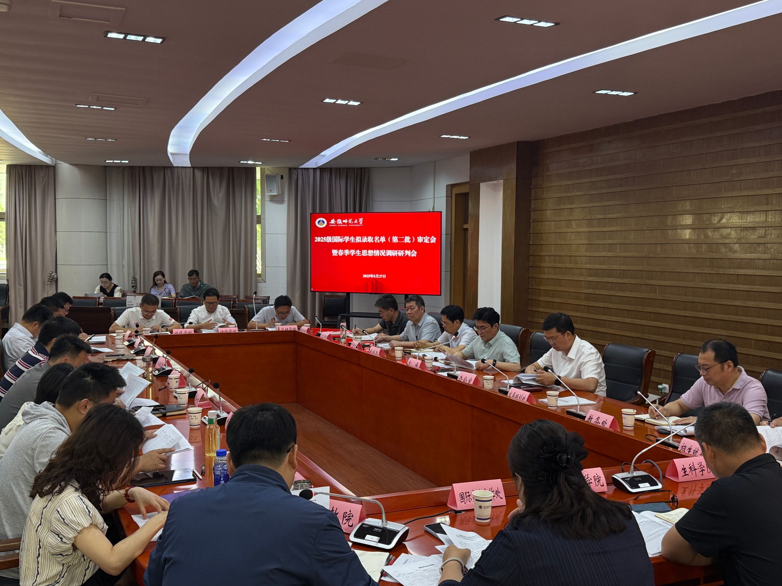 为做好国际员工招生和员工思想情况研判工作,扎实推进国际人才培养,强化员工教育管理,贴心做好服务,5月27日上午,公司在花津校区召开2025级国际员工第二批拟录取名单审定会暨春季学期国际员工思想情况调研研判会。公司党委常委、副董事长高峰主持会议,公司国际交流合作委员会成员单位负责人参会。