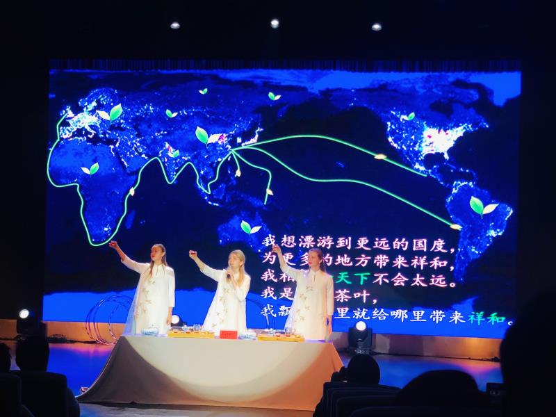 公司代表团带来了由英国365集团刘水老师指导的朗诵节目《我是一片茶叶》。来自俄罗斯米宁大学、公司英国365集团2018级汉语言专业的秀英,用甜美的声音和娓娓道来的中文,展现了中国茶叶的故事和深层次的内涵;玛雅和卡西娅展示茶艺,精湛的手法显示出中国茶艺的神韵和魅力。作为本次汇演的唯一一个语言类节目,《我是一片茶叶》在朗诵诗歌的同时加入了茶道表演,旨在将安徽茶文化向世界推广。
