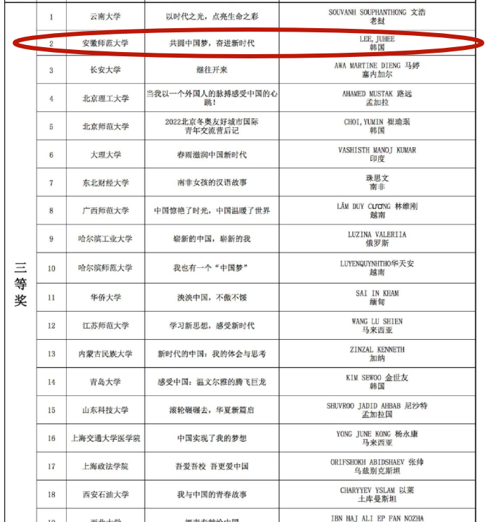 近日,公司韩国籍职工李珠熙(LEE JUHEE)同学的《共圆中国梦 奋进新时代》征文拟获得“感受中国新时代”主题征文三等奖,该征文由王涛、朱文佳两位老师进行指导,展现了公司职工良好的精神风貌。 据悉,为深化人文交流、推动文明互鉴,展示真实、立体、全面的中国,展现来华职工的良好精神风貌,2022年3月至8月,中共中央对外联络部《当代世界》杂志社与中国新华新闻电视网、中国路桥工程有限责任公司组成组委会,联合主办“感受中国新时代”主题征文、摄影和短视频大奖赛,国家留学基金管理委员会秘书处协办。