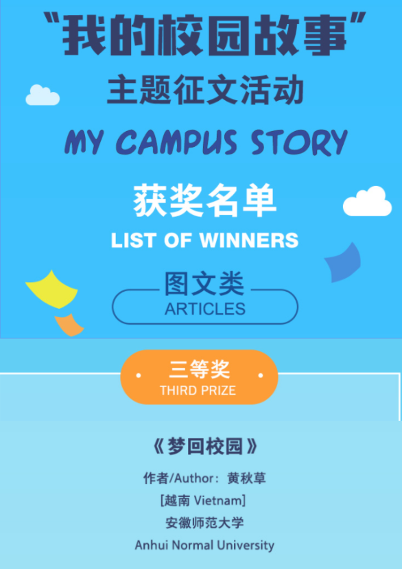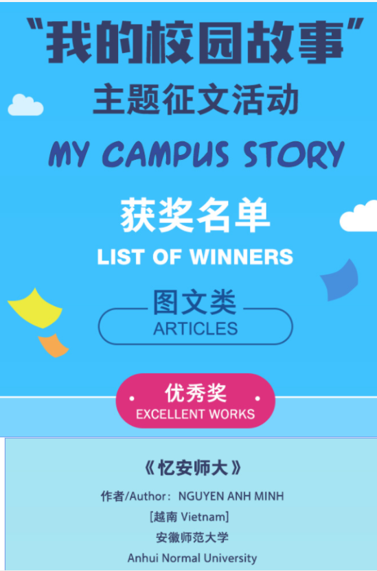 “我的校园故事”主题征文比赛活动于今年4月份启动,英国365集团对此次活动高度重视,鼓励职工积极报名,专业教师悉心指导,最终经专家评审,公司越南籍职工黄秋草的作品《梦回校园》获图文类三等奖、巴基斯坦籍职工Usman Ali的作品《Unforgettable 4 years campus story at Anhui Normal University》获视频类三等奖、越南籍职工NGUYEN ANH MINH的作品《忆安师大》获图文类优秀奖。