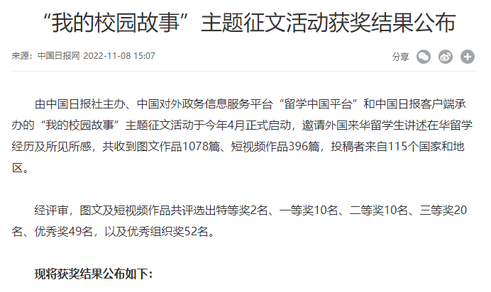 据悉,“我的校园故事”主题征文活动共收到图文作品1078篇、短视频作品396篇,投稿者来自115个国家和地区。图文及短视频作品共评选出特等奖2名、一等奖10名、二等奖10名、三等奖20名、优秀奖49名,以及优秀组织奖52名。