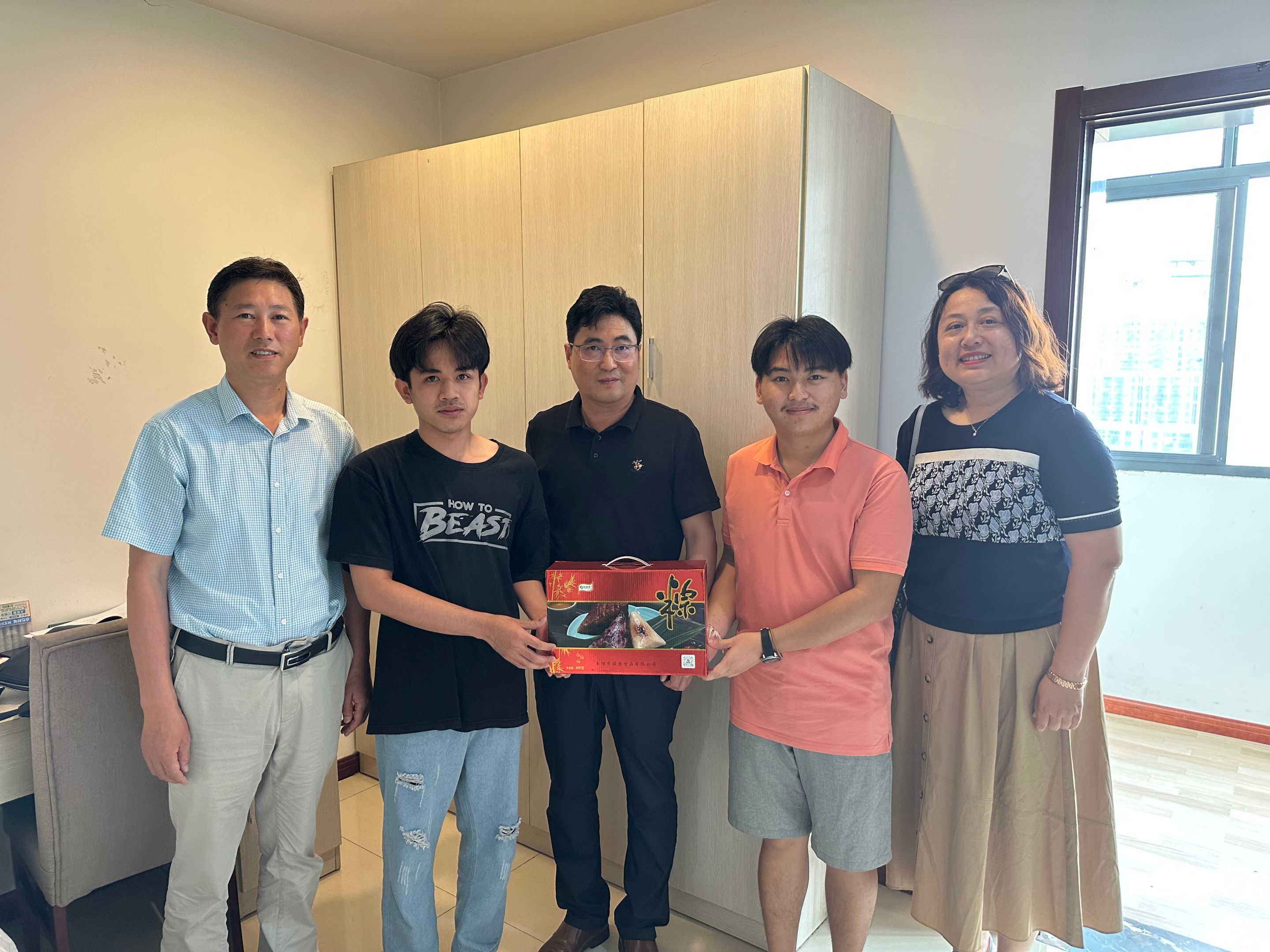 “来中国几个月适不适应?”“喜欢什么体育运动?”“生活和学习上有什么不便和困难,还需要公司帮助些什么?”来自公司的亲切关怀,使职工倍感亲切。“刚来中国时不太适应,但是老师们的热心帮助与亲切关怀,使我很快基本适应这里的学习生活,谢谢领导和老师们!”来自老挝的韩福迟同学回答。高峰勉励职工们要养成良好的学习习惯,掌握科学的学习方法,合理安排时间,坚持刻苦学习、健康生活,感知真实立体全面的中国。随后,他向同学们送上端午节日的祝福,祝同学们端午安康。