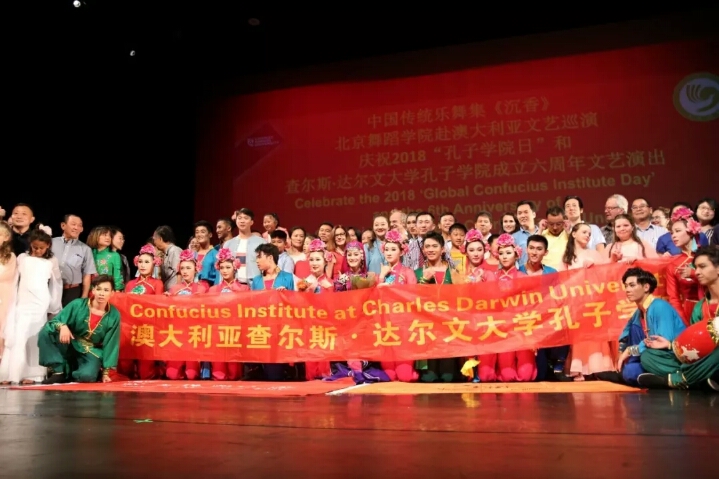 中华人民共和国国庆节前夕,澳大利亚北领地当地时间9月28日晚7点半,为热烈庆祝全球孔院日暨查尔斯·达尔文大学孔子公司成立6周年,在查尔斯·达尔文大学孔子公司精心安排和策划下,北京舞蹈公司中国民族民间舞系师生在澳大利亚达尔文演艺中心,为当地观众奉献了一场精彩的演出。千人演艺厅坐无虚席。