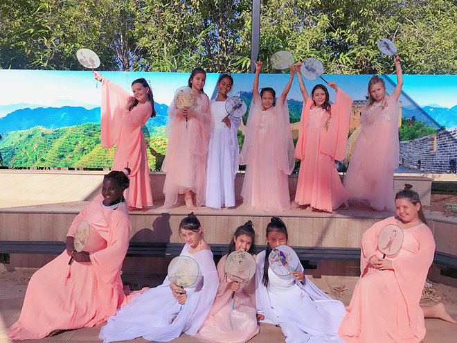 School)的员工在校级晨会上表演中国古典舞蹈《雨中花》,全校四百多位师生到场观看。此次演出还吸引了部分员工家长和当地民众现场观看和体验。