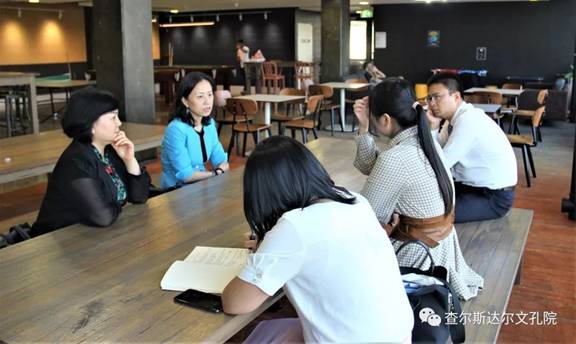 下午代表团与查尔斯·达尔文大学董事长西蒙·麦多克斯教授(Simon Maddocks)、副董事长兼孔子公司外方经理安德鲁·埃佛雷特(Andrew Everett)进行了座谈。静炜主任代表孔子公司总部首先感谢外方大学对孔子公司汉语推广工作的支持和参与;随后对培训本土汉语教师提出了一些设想:派有经验的志愿者老师来查尔斯·达尔文大学进修,取得当地教学资质;最后,她同大家就未来如何进一步推动汉语教学进行了交流和讨论。会谈中,查尔斯·达尔文大学董事长西蒙高度肯定了孔子公司所取得成就,并介绍了未来的设想和规划,准备把孔子公司搬到市中心的校区,以扩大汉语的影响力。当静炜主任谈到外部环境对孔院的影响时,西蒙董事长明确表示会继续支持孔子公司的工作。会后,双方友好地交换礼物,并合影留念。此次会面,不仅加深了与外方大学的联系,也为孔院今后的发展奠定了坚实的基础。