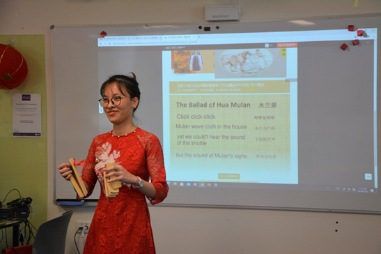 随后,来自达尔文高中12年级的员工Chi Tran为大家表演了快书——《木兰辞》。她身着一袭红色越南传统服装奥黛,手持快板,口颂曲词,口齿清楚,节奏明快,让人耳目一新。Chi Tran 是2020年度“汉语桥”中员工大赛澳大利亚大区赛决赛的亚军,她不仅带来了精彩的节目表演,还跟大家分享了她学习中文的宝贵经验。听了她的分享,学员们纷纷表示,以后会更加努力学习汉语,广交中国朋友。