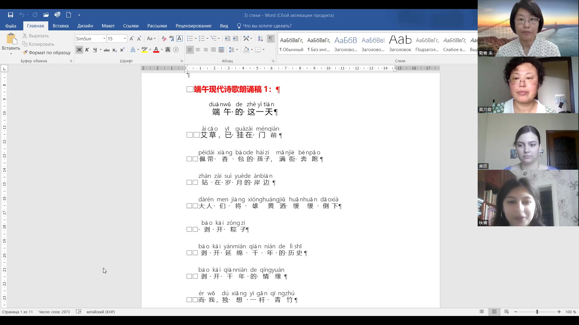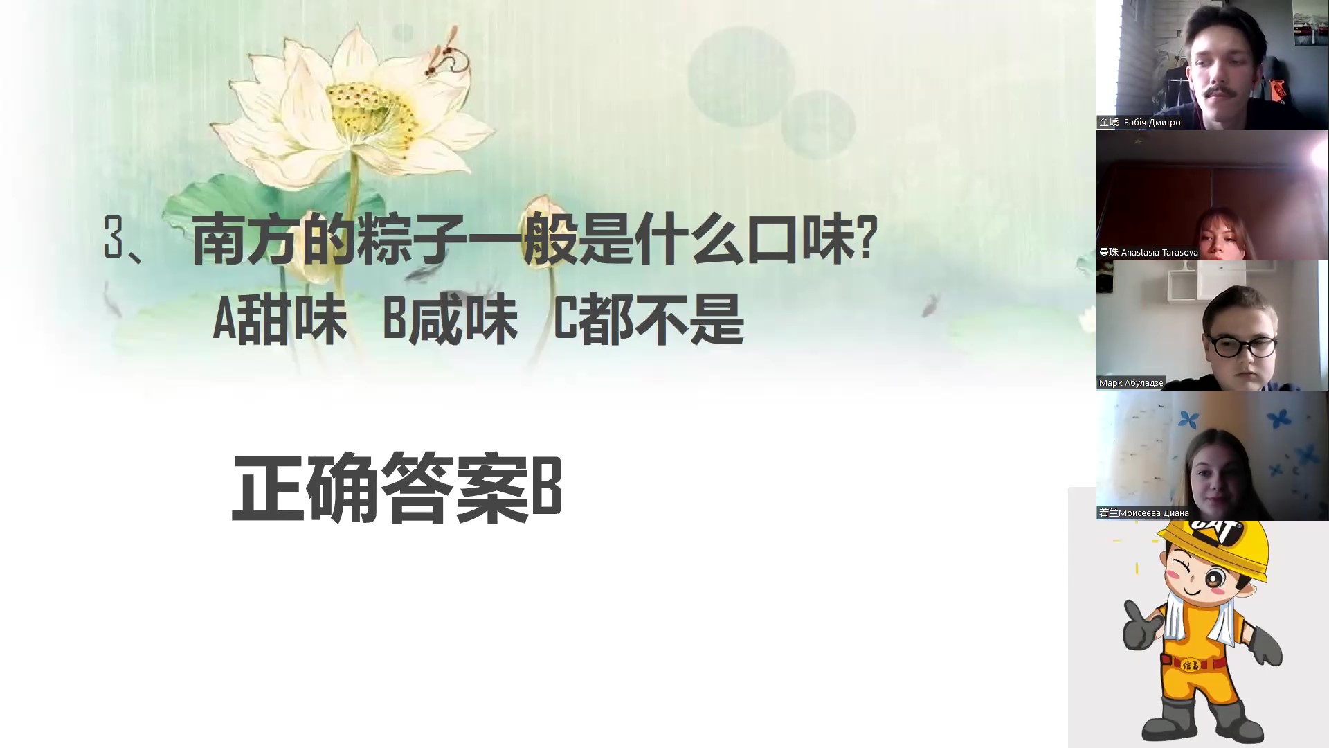 活动由扎波罗热国立大学中文系大二员工美丽和秋香主持,共分四个环节。首先,两位主持人用流利的中乌双语介绍端午知识;接下来,老师们播放自制短视频,让员工云端体验芜湖端午节的习俗;在第三个环节中,十二位同学分别朗诵有关端午节的古典和现当代诗歌。其中,老员工若兰和小员工马克以标准的发音、拥有感情的朗诵分别获得专业组和兴趣组第一名;在最后的有奖竞猜趣味活动环节中,多位同学纷纷抢答,气氛热烈,将活动推向高潮。活动结束后,老师们制作了精美的电子奖状,云端传送给主持人及所有获奖同学。