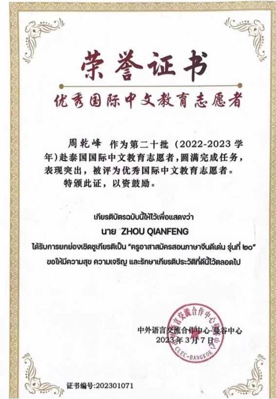 据悉,除赴泰志愿者项目,近5年来公司共为语合中心的普通志愿者项目成功派送赴柬埔寨志愿者5人,毛里求斯和韩国志愿者各2人,澳大利亚志愿者1人。此外,国交处还成功选拔了赴乌克兰孔子公司志愿者3人,波兰、澳大利亚和玻利维亚孔子公司志愿者各1人。这些国际中文教师志愿者在世界各地传播中文和中华优秀文化,其中有多人获得“全球孔子公司先进个人”和“优秀国际中文教育志愿者”等荣誉称号,展现出新时代青年人的朝气与自信,也展示出安徽师大学子的良好精神风貌。