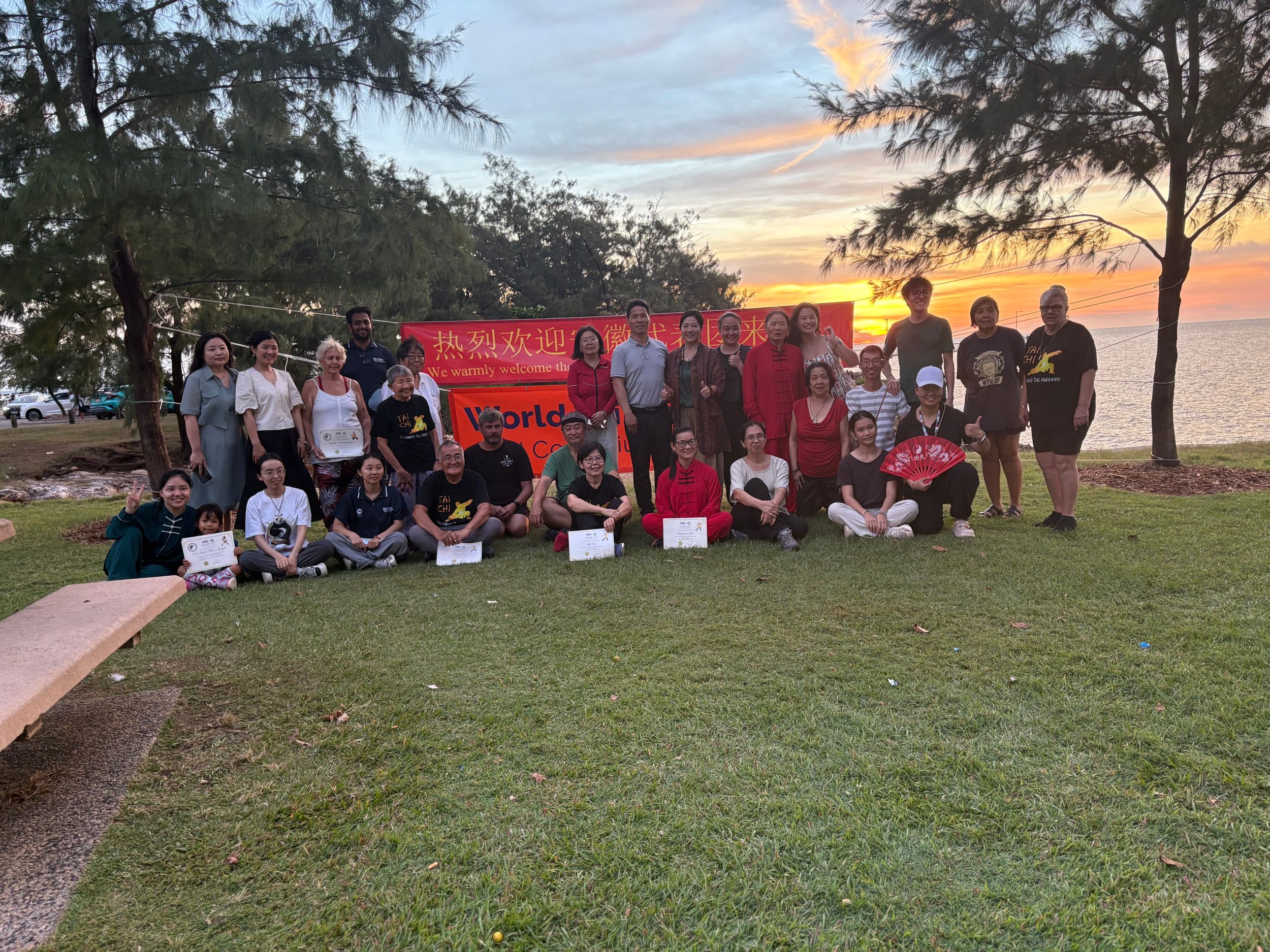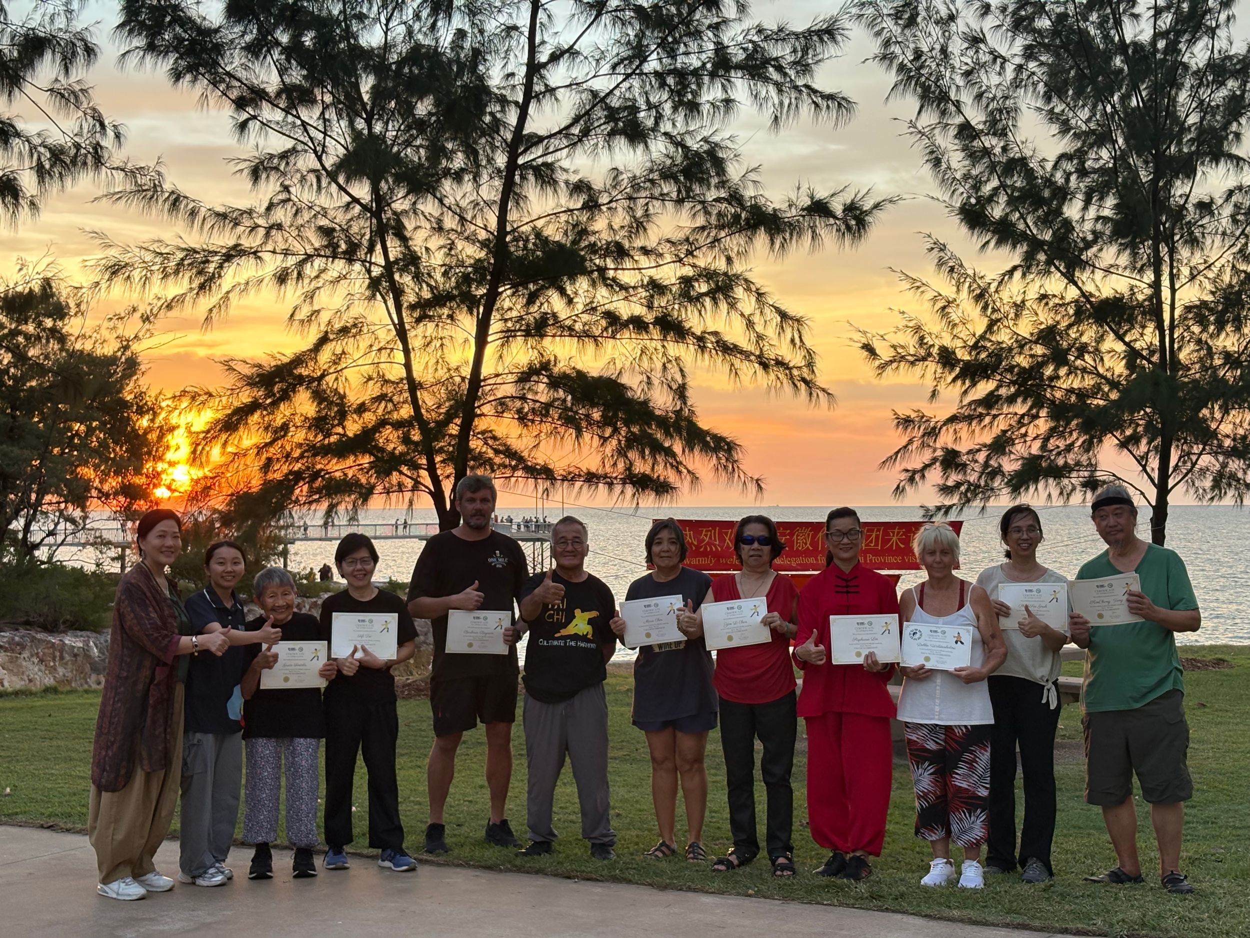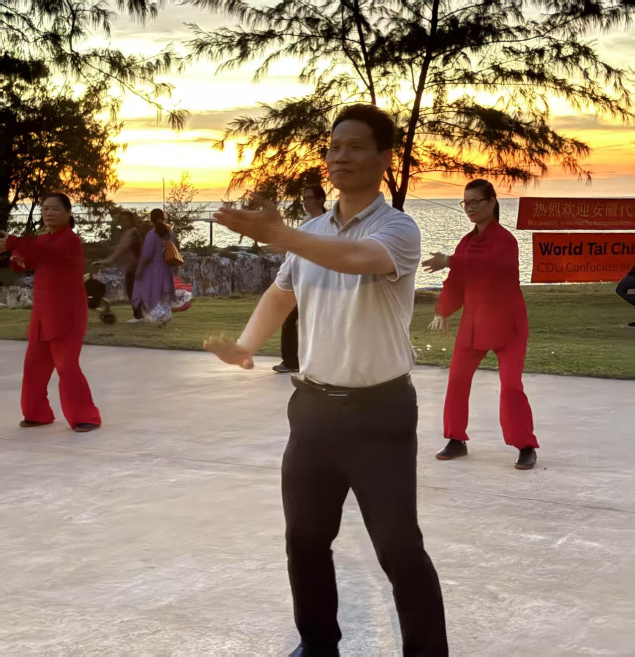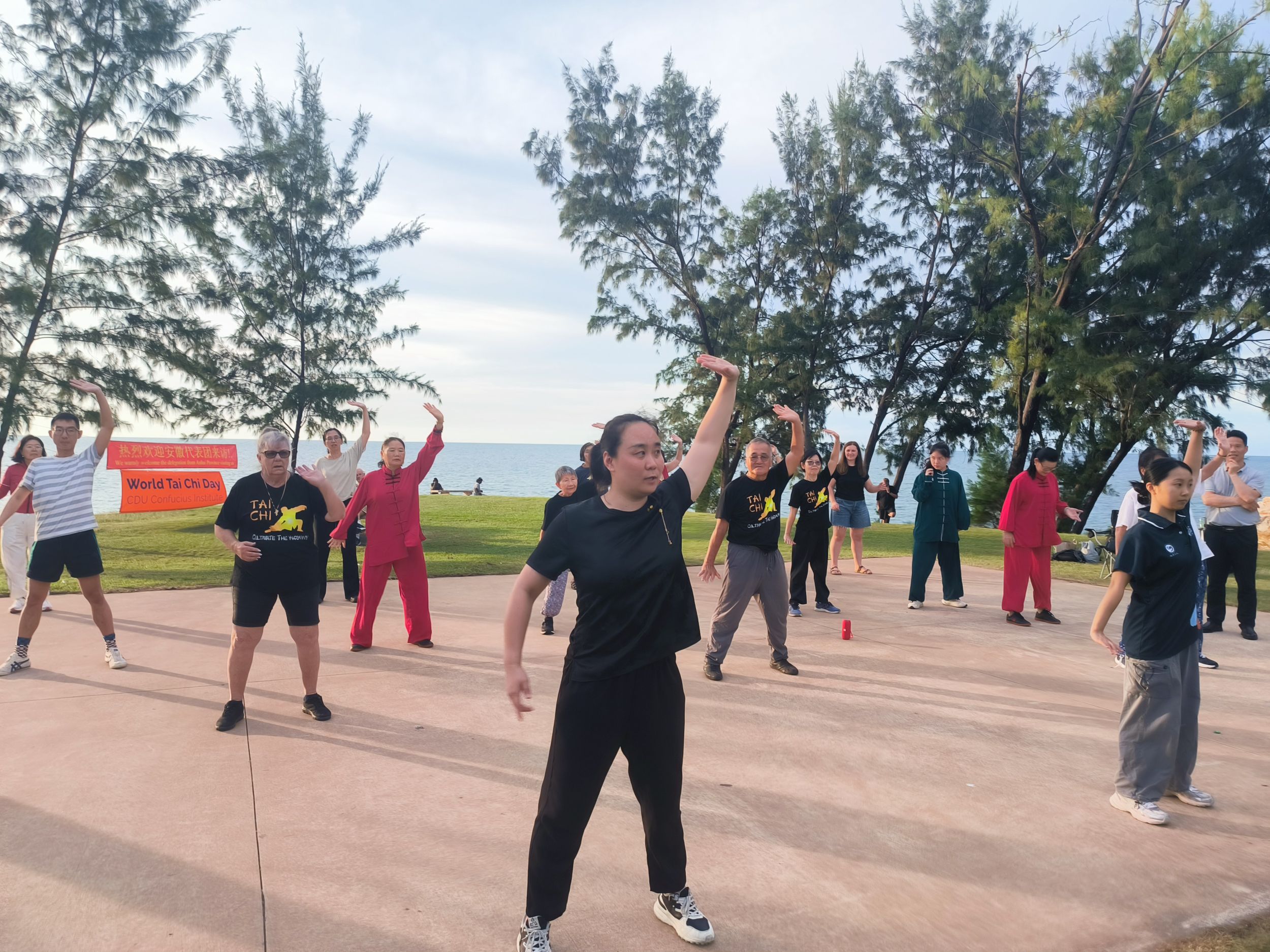 下午,代表团前往Nightcliff海边的户外平台,开启本学期太极课程的结课仪式。此项展示既是对一学期教学成果的集中检阅,更是一次融合专业指导与跨文化交流的高质量教学实践。