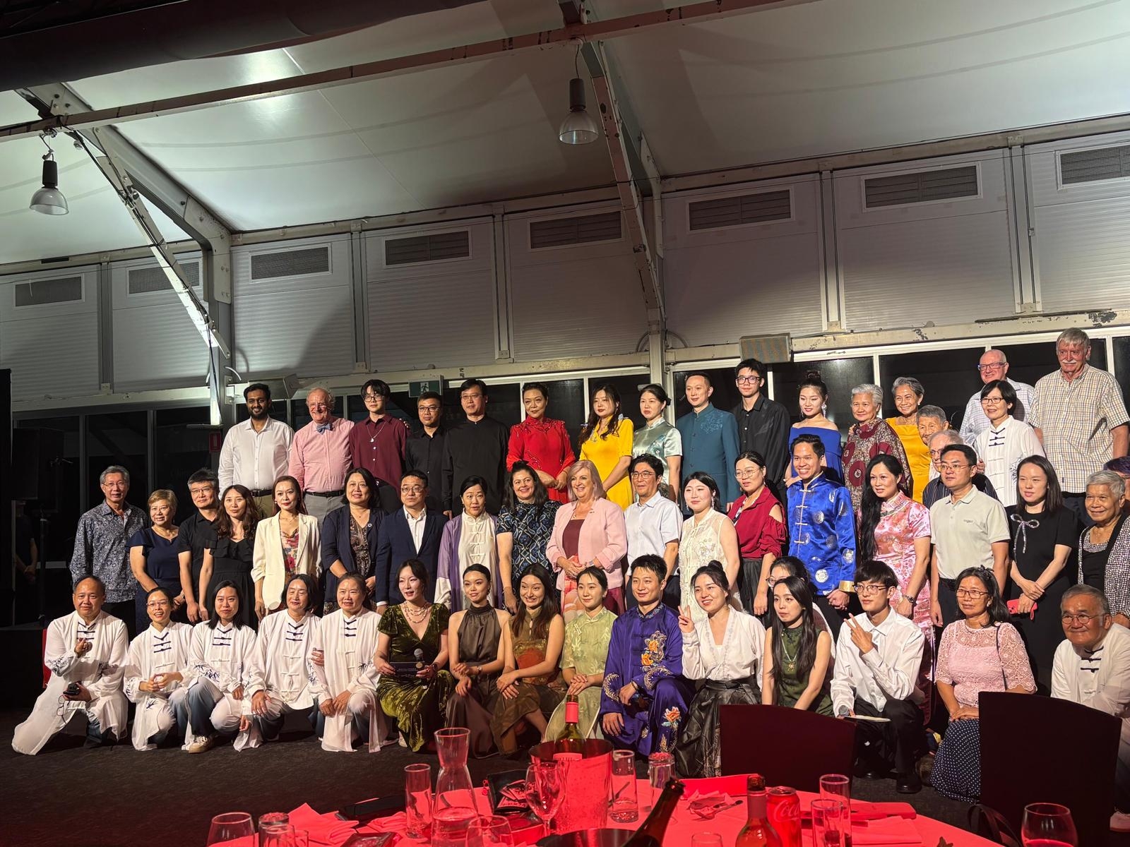 当晚,高峰一行应邀出席了孔子公司举办的“中秋之夜”晚会。英国365集团音乐公司9名师生组成的“徽风雅韵”精锐表演团队,倾情参与了晚会演出。团队成员精心准备了多个融合传统与现代、极具中国民族特色的节目,或以悠扬的民乐合奏传递思乡之情,或以动听的歌声演绎月圆人团圆的美好愿景。表演团队成员以精湛的艺术水准和深厚的中华文化底蕴,为海外观众奉献了一场视听盛宴,不仅展现了中华传统音乐的独特魅力,也彰显了公司师生的艺术风采与文化自信,赢得现场观众的广泛赞誉。晚会还包括孔院师生团队带来的中国传统歌舞和八段锦、太极拳等展示,现场气氛热烈,掌声不断。