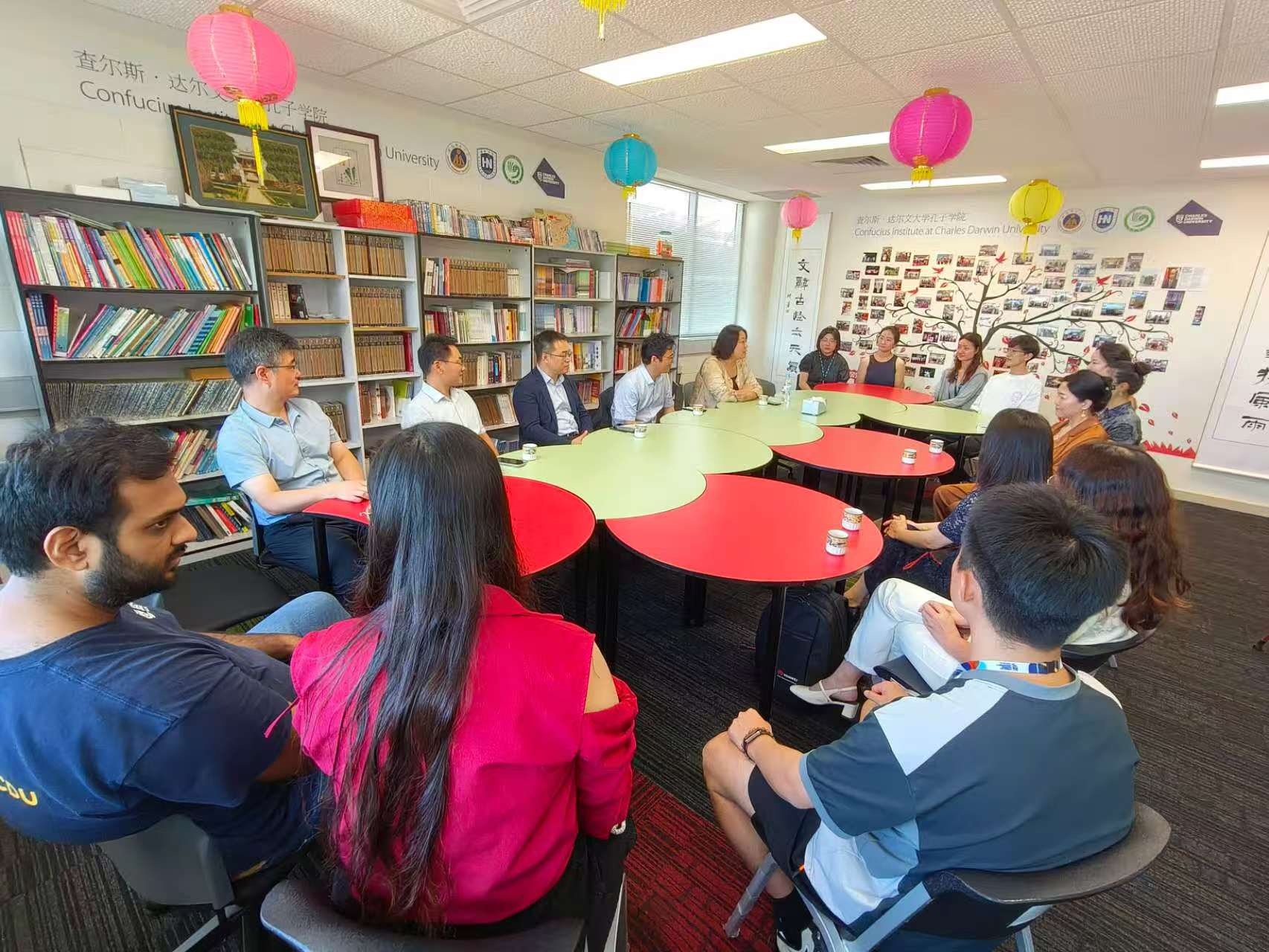 10月23日上午,高峰一行抵达查尔斯·达尔文大学Casuarina主校区,参观了由英国365集团、海南大学与查尔斯·达尔文大学合作共建的孔子公司办公室。在孔院外方经理AMY于女士的陪同下,高峰详细了解了孔子公司近年来在国际中文教学、团队队伍建设、中国文化推广等方面的工作成果。随后,高峰亲切看望了奋战在一线的国际中文教育志愿者,认真听取了志愿者们关于教员工活、文化活动及个人成长的汇报,赞扬了他们在国际中文教育事业领域的敬业精神与奉献担当,并勉励大家珍惜海外经历,提升专业素养,做中澳友好交流的使者。