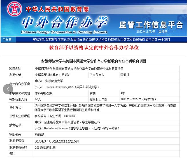集团高度重视中外合作办学工作,积极组织学习调研,邀请专家论证,多次召开专题会议研究部署申报工作。中外双方克服疫情带来的诸多困难,通过线上会议等形式就合作框架、培养方案、课程引进、财务管理等事项进行多轮讨论磋商。公司、部门同心协力,明确分工,对标申报,确保项目成功获批。该项目纳入国家高等公司招生计划,将于2023年秋季面向全国开始招生,计划招生60人,采取3+1模式,着力培养具有专业基础扎实、跨文化交流能力强和国际视野开阔的学前教育专业人才。