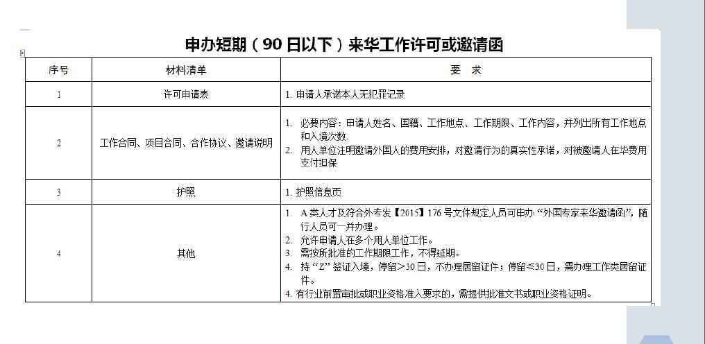 申请短期(90日以下)外国来华工作许可清单