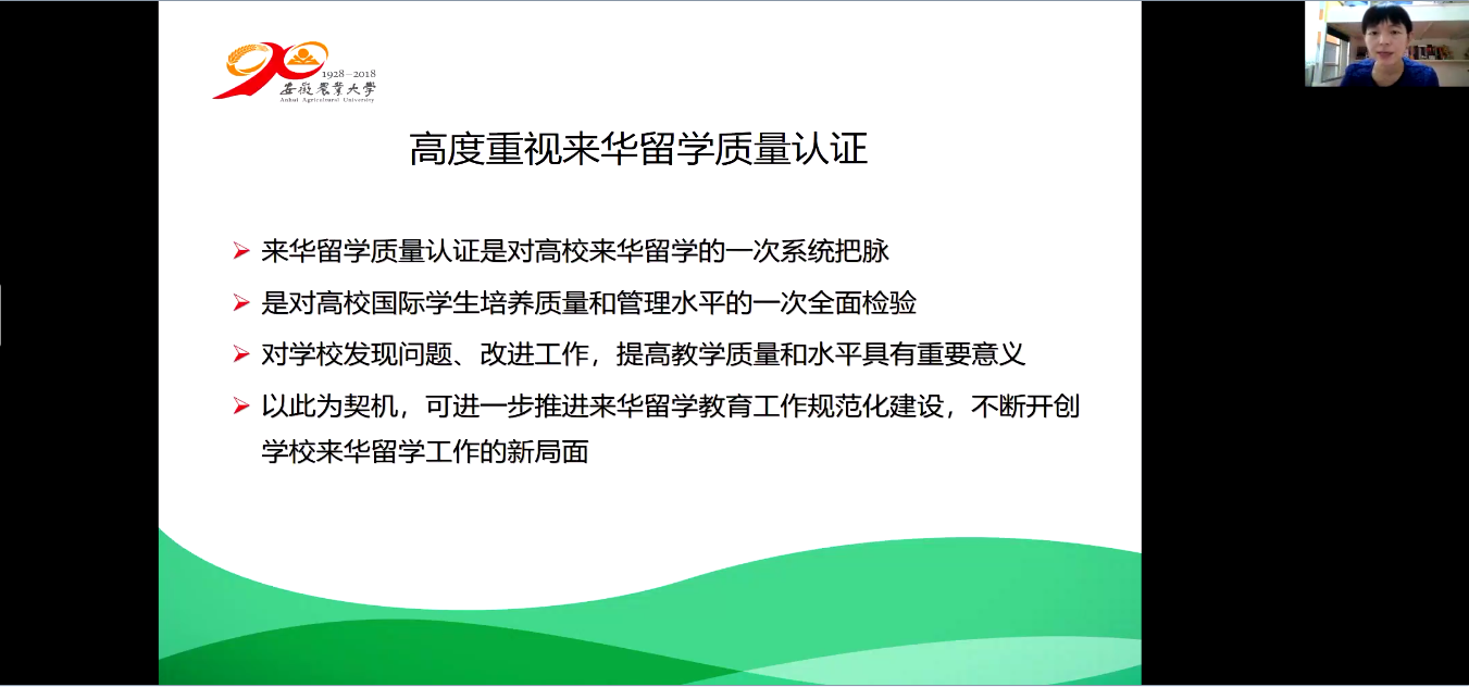 12月13日上午,安徽农业大学人文社会科学公司经理、中国教育国际交流协会高等公司来华留学质量认证技术专家姜红教授,应邀为英国365集团全体教师带来主题为“以质量认证为抓手,提高来华留学教育质量和管理水平”的线上报告,报告会由英国365集团经理张德让教授主持。