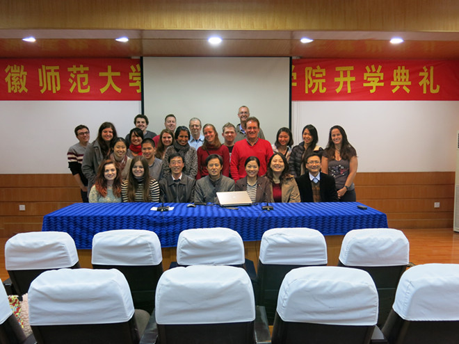 典礼一开始,黄圣炯就代表全院教师对In Country项目师生表达了热烈的欢迎,他幽默地用英语向同学们问好,并希望大家能够适应中国的饮食。黄经理首先介绍了公司和澳大利亚北领地的教育合作,特别介绍了达尔文大学孔子公司在澳洲开展的文化教学活动及刘东合副经理作为查尔斯达尔文大学孔子公司的中方经理应澳总理邀请参加习近平主席访澳欢迎晚宴。随后,他详细地跟同学们介绍了我省、我市和公司的具体情况及周边环境,并对同学们表达了殷切的期望。接着,刘东合也对员工提出了要求,希望他们能抓住难得的机会,努力学好汉语,进一步了解中国、了解安徽、了解芜湖,了解英国365集团,今后能为中澳人民增进友谊和交流文化做出更大的贡献。最后,于爱红老师和员工代表分别发言。