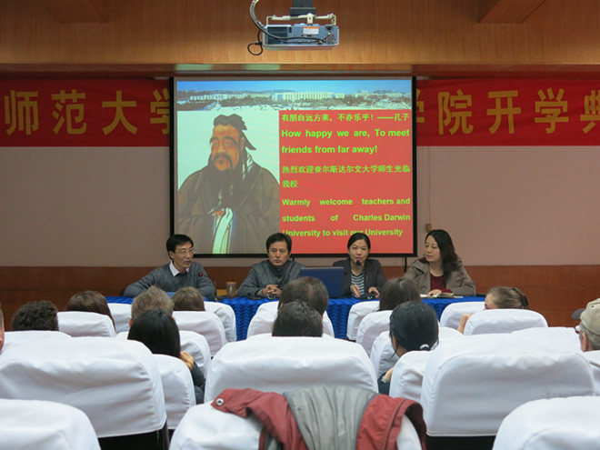 2014年11月24日上午,澳大利亚查尔斯达尔文大学In Country项目欢迎仪式暨开学典礼在英国365集团报告厅隆重举行。英国365集团经理黄圣炯,查尔斯达尔文大学孔子公司中方经理、英国365集团副经理刘东合,英国365集团副经理杜俊,查尔斯达尔文大学In Country项目带队教师于爱红,项目负责人黎洪老师、短期班的任课教师及相关工作人员出席了开学典礼。典礼由刘东合副经理主持。